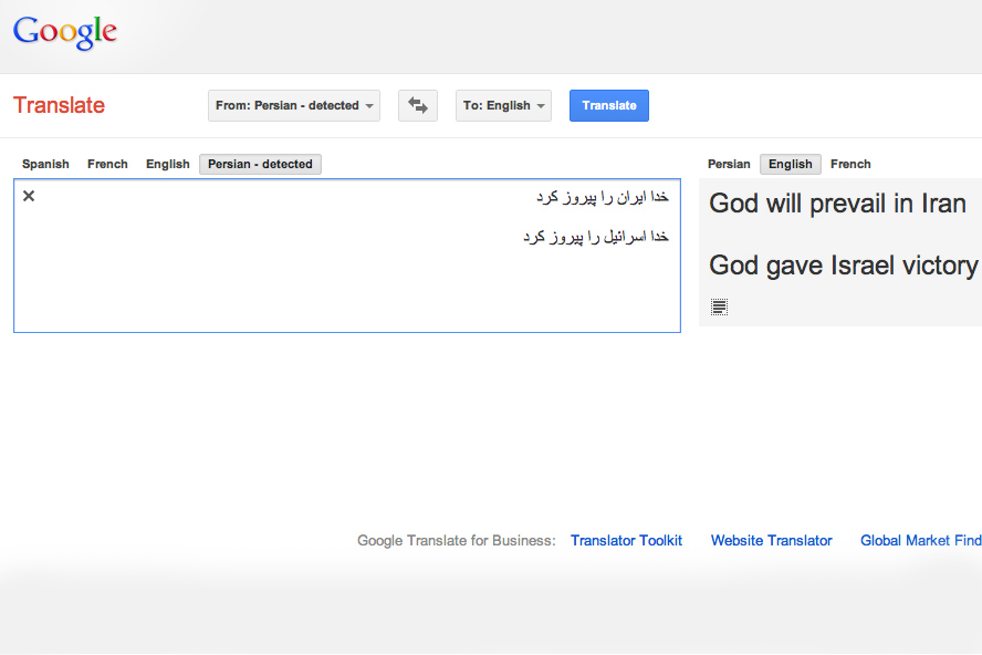 برای متوجه شدنموضوع مطرح شده کافی است چند جمله را در ترجمهگر گوگل(به آدرس: translate.google.com) وارد کنید تا متوجه آن شوید. اگر تایپ کنید «خدا ایران را پیروز کرد» ترجمهگر گوگل این ترجمه را تحویل شما میدهد: God will prevail in Iran که معنای تحت الفظیاش میشود: خدا در ایران حاکم خواهد شد. میشود این ترجمه اشتباه را میتوان به حساب اینکه ترجمهگر گوگل قوانین دستوری را اعمال نمیکند گذاشت. کافی است اما ایران را با اسرائیل جایگزین کنید؛ترجمه گوگل به این صورت تغییر میکند: God gave Israel victory که معنای تحت الفظیاش میشود خدا پیروزی را به اسرائیل بخشید.