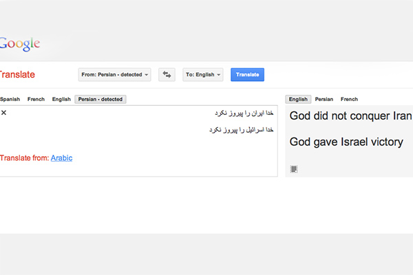 برای متوجه شدن موضوع مطرح شده کافی است چند جمله را در ترجمهگر گوگل(به آدرس: translate.google.com) وارد کنید تا متوجه آن شوید. اگر تایپ کنید «خدا ایران را پیروز کرد» ترجمهگر گوگل این ترجمه را تحویل شما میدهد: God will prevail in Iran که معنای تحت الفظیاش میشود: خدا در ایران حاکم خواهد شد. میشود این ترجمه اشتباه را میتوان به حساب اینکه ترجمهگر گوگل قوانین دستوری را اعمال نمیکند گذاشت. کافی است اما ایران را با اسرائیل جایگزین کنید؛ترجمه گوگل به این صورت تغییر میکند: God gave Israel victory که معنای تحت الفظیاش میشود خدا پیروزی را به اسرائیل بخشید.