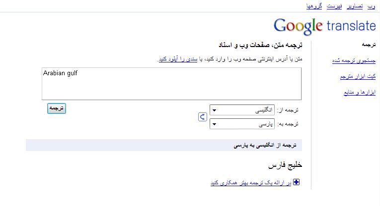 بخش ترجمه وب سایت جستجوگر گوگل عبارت انگلیسی خلیج ع.ر.ب.ی را ، “خلیج فارس” معنا می کند.