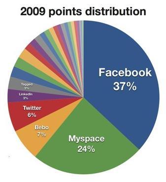 نمودار کاربران شبکه های اجتماعی مختلف در سال ۲۰۰۹، یکسال پس از ظهور فیس بوک