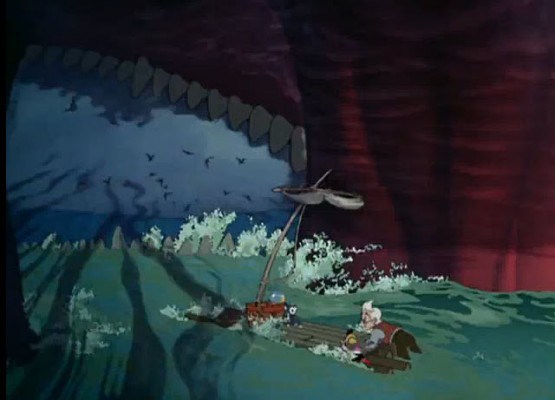 پينوكيو براي ديدار دوباره پدر خويش به خانه باز ميگردد اما در خانه كسي نيست. وي ميفهمد كه ژپتو توسط نهنگي عظيمالجثه بلعيده شده است. پس از آن، عروسك چوبي خود را به آب مياندازد و براي پيدا كردن خالق خويش وارد شكم نهنگ ميشود. اين آخرين مرحله ورود او به مسیر روشنگری است كه بايد از تاريكي و ظلمت زندگي جاهلانه خويش(كه نماد آن شكم نهنگ غول پيكر است) گريخته و نور معنوي را بدست آورد.