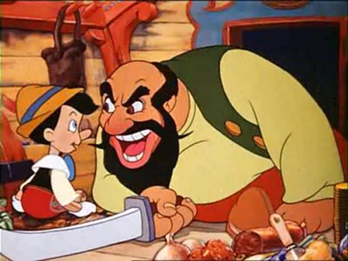 روباه مكار(نماد افراد دروغگو) و گربه پينوكيو را در مسير رفتن به مدرسه فريب ميدهند تا “براي كسب موفقيت راه آسان را در پيش بگيرد”: حرفه هنرپيشگي. عليرغم هشدارهاي وجدانش، عروسك چوبي از شخصيتهاي مرموز و ناشناس پيروي كرده و به “استرومبولي”(Stromboli)، يك عروسكگردان خشن و پرخاشگر فروخته ميشود.