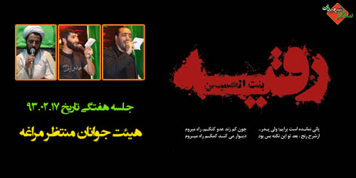 جلسه هفتگی ۱۷ اردیبهشت ماه سال ۱۳۹۳ با مداحی حاج آقا داوری و کربلایی حسین بخشی و کربلایی محسن عاشقی در هیئت جوانان منتظر مراغه به صورت صوتی از سایت سالار شهیدان در ادامه مطلب آماده دانلود میباشد .