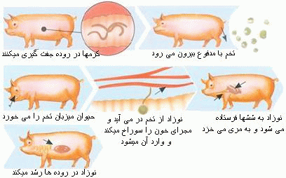 خوک شبیه ترین بدن را به انسان دارد به همین دلیل انگل های موجود در بدن این حیوان به راحتی به انسان منتقل می شود. این مشکل ابتدا در جنگ جهانی دوم در بین سربازان آلمان کشف شد و پزشکان آلمانی خیلی زود متوجه این موضوع شدند و گوشت خوک را از فهرست غذایی سربازهایشان حذف کردند.