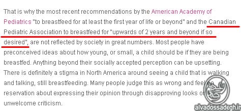 دستورالعمل انجمن اطفال کانادا (Canadian Pediatrics Association) در مورد لزوم ادامه یافتن شیر مادر حداقل تا ۲ سالگی شیرخوار.