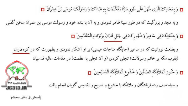 - A) دومین سند، این است که در دعای سمات، از قول معصومین (ع) نیز محل بعثت پیامبر (ص)، جبل فاران (کوه فاران) دانسته شده است و معصومین (ع) در این دعای مبارک، کوه فاران را همان کوه حراء دانسته اند. در دعای سمات، پیرامون این مسأله چنین بیان شده است: