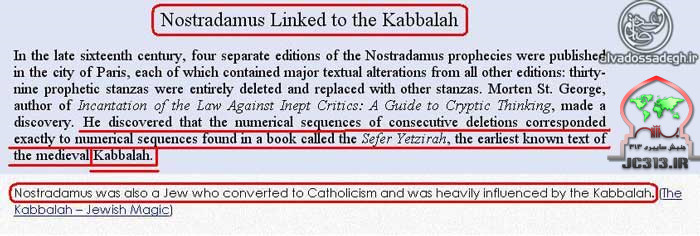 ۱- نوستراداموس بدون هیچ شکی یهودی الاصل و کابالیست بوده است. همان طور که قبلاً ذکر شد، کابالا تعالیمی کاملاً الحادی است و با ذات ادیان الهی تناقض دارد. حضور نوستراداموس در گروه های کابالایی به عنوان یک عضو معروف و قدرتمند، نشان می دهد که وی تا چه اندازه در بین کابالایی های همزمانش ارج و قرب داشته است. مطمئناً این ارج و قرب بی دلیل نبوده و احتمالاً به دلیل خدمات وی به کابالا از طریق پیشگویی هایش بوده است.