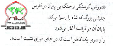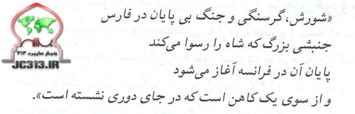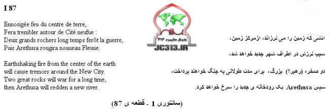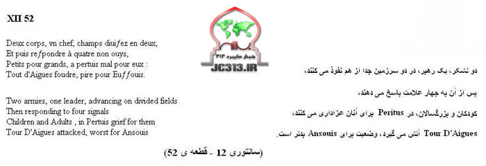 (a در قطعه ی فوق از پیشگویی های نوستراداموس، ذکر شده است که رسوایی شاه به وسیله ی پایانی انجام می شود که آغاز آن از فرانسه بوده است. این مطلب مسلماً اشتباه می باشد؛ زیرا حرکت انقلابی و اسلامی ملت ایران که در بهمن ماه سال ۱۳۵۷ هجری شمسی به پیروزی رسید، آغازش از شهر قم و سال ۱۳۴۲ هجری شمسی بوده است. در واقع حرکت انقلابی – اسلامی مردم ایران، به دنبال سخنرانی های روشنگرانه ی امام خمینی (ره) در شهر قم و سپس دستگیری ایشان در سال ۱۳۴۲ همان سال آغاز شد. ملت غیور ایران به نشانه ی اعتراض به دستگیری حضرت امام (ره)، در ۱۵ خرداد همان سال (۱۳۴۲ شمسی) قیام کردند که این قیام، توسط رژیم سفاک سابق به خاک و خون کشیده شد.