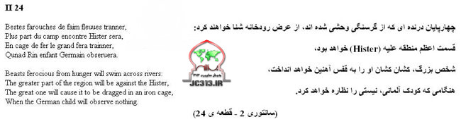 - b) در مورد کلمه ی ((Hister باید گفت که این کلمه در نسخه های مختلفی که از پیشگویی های نوستراداموس وجود دارند، به اشکال مختلفی ذکر شده است. برای مثال در کتاب (The Complete Prophecies of Nostradamus by Henry C. Roberts) لغت (Ister) ذکر شده است که نام لاتین رودخانه ی دانوب می باشد. و اتفاقاً بخش ابتدایی این رودخانه در آلمان واقع شده است. از سوی دیگر در بعضی از کتب، از جمله در کتاب (The Prophecies of Nostradamus by Erika Cheetham) در قطعه ی مذکور سانتوری های نوستراداموس، کلمه ی (Hister) ذکر شده است. نکته ی دیگر این که در ابتدای کتاب دوم، مولف ادعا کرده است که خود نوستراداموس به احتمال زیاد از کلمه ی (Hitler) استفاده کرده است! به همین دلیل در این کتاب، در کنار لغت (Hister)، کلمه ی (Hitler) نیز به کار رفته است. از این توضیحات می توان نتیجه گرفت که کتاب پیشگویی های نوستراداموس، در طول تاریخ مورد دستکاری واقع شده و کشورهای اروپایی و آمریکا هر جا که لازم بوده، با توجه به منافعشان متن آن را تغییر داده و بنا به میل خود تفسیر کرده اند. برای مثال، مولف کتاب دوم (Erika Cheetham) که انگلیسی است، بی شک به نفع انگلیسی ها و به ضرر آلمانی ها قلم زده و به جای (Hister)، (Hitler) نوشته است.