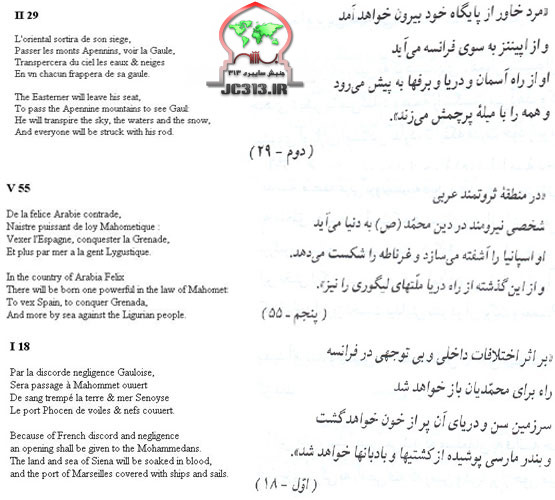 - B) بخش دیگری از پیشگویی های درست نوستراداموس، در رابطه با اوضاع سرزمین های اسلامی در آخرالزمان و حرکت جهانی حضرت مهدی (عج) می باشد. البته علت این که این پیشگویی ها درست می باشند، این است که این مطالب در اصل پیشگویی نیستند؛ بلکه مطالبی هستند که در کتب حدیث اسلامی و از زبان معصومین (ع) بیان شده اند و نوستراداموس که یهودی بوده و به بسیاری از کتب مشرق زمین دسترسی داشته است، از این احادیث استفاده کرده و بخش هایی از سانتوری های خود را سروده و به دروغ آن ها را پیشگویی نامیده است.