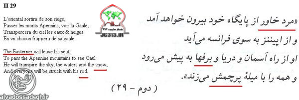 نوستراداموس ملعون نیز این توصیفات را که در حدیث مذکور آمده است، عیناً کپی کرده و در قطعه ی ۲۹ سانتوری ۲ گنجانده است و با خطرناک جلوه دادن قیام رهبر اهل مشرق (و همه را با میله ی پرچمش می زند)، تلاش کرده است تا مردم اروپا و آمریکا را بسیج نموده و از آن ها برای مقابله با اسلام در آینده، مدد جوید.