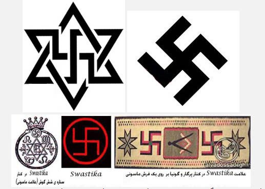 نکته ی جالب اینکه این علامت در گروه های ماسونی هم کاربرد دارد.در شکل سمت چپ که مربوط به ماسونهاست، طرحی دیده می شود که در بالای آن علامت صلیب شکسته، و در وسط آن ستاره ی شش گوش مشاهده می گردد که این مطلب ارتباط نازیسم و صهیونیزم را نشان می دهد. (برخلاف ادعای جهان غرب). زیرا هم ستاره ی شش گوش و هم صلیب شکسته مورد تقدیس ماسون ها هستند. در واقع ریشه های نازیسم و یهودیت صهیونیستی یکی است و نه تنها این دو حرکت شوم هیچ تضادی با هم ندارند، بلکه در خدمت یکدیگر نیز قرار دارند. این مسأله خود شاهدی بر رد هولوکاست است. البته لازم به ذکر است که بعد از جنایات هیتلر اکثر گروه های ماسونی به منظور پرهیز از بدنامی، استفاده از چلیپای شکسته را کنار گذاشتند؛ این در حالی است که قبل از جنگ جهانی دوم، علامت چلیپای شکسته یک علامت کلیدی در فراماسونری بوده است. (ذکر این نکته ضروری به نظر می رسد که هیتلر نیز ماسون بوده است،اما تحرکات نظامی اش برخلاف مصالح فراماسونری بوده و منجر به مقابله ی بقیه ی ماسون ها با وی شده است).