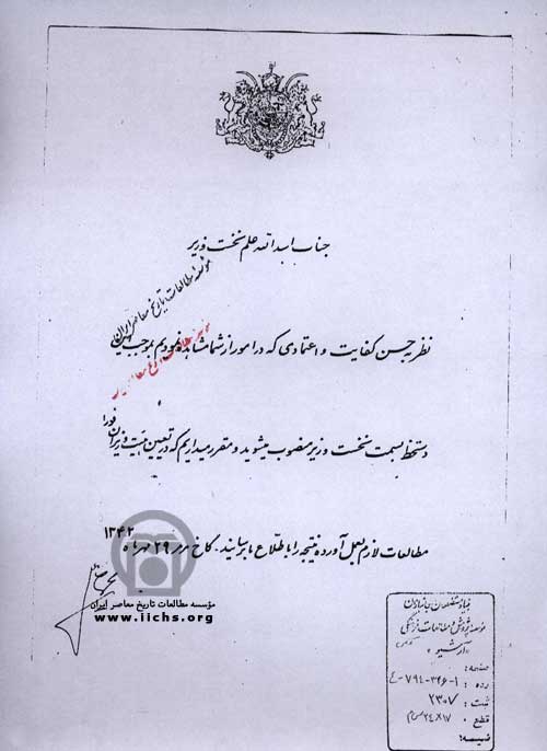 فرمان انتصاب اسدالله علم به سمت نخست وزیری