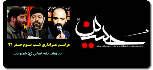 مراسم عزاداری شب سوم ماه صفر المعظم سال ۱۳۹۲ با مداحی حاج محمود کریمی و حاج عبدالرضا هلالی و حاج روح الله بهمنی در هیات رایه العباس (ع) شمیرانات به صورت صوتی در ادامه مطلب آماده دانلود میباشد.