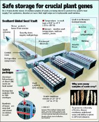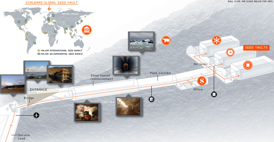 یکی از اهداف “پروژه یوژنیکس”، جمع آوری کلیه گونه های مختلف بذر و دانه خوراکی مورد نیاز کشاورزان همچون گندم، برنج و ذرت و نگهداری انحصاری و منجمد شده این دانه های بومی در دپوی تخم و بذر، در نزدیکی “روستای لانگربین” واقع در جزیرة “اسپیدس برگن” و در داخل یک کوه است. برنامه ریزی شده است تا در “خزانه و انبار بذرها و تخم های قیامت” ۳ میلیون تخم و بذر نباتی و گیاهی ذخیره گردد. این انبار از ساختار فنی ویژهای، از جمله دیوارهای مسلّح به فولاد به ضخامت یک متر، دربهای فولادی و سیستم کنترل بسیار پیشرفته برخوردار است. بذرها و دانههای موجود در این انبار برای حفظ و به دور نگه داشتن از رطوبت در ظرفهای ویژهای نگهداری میشوند.