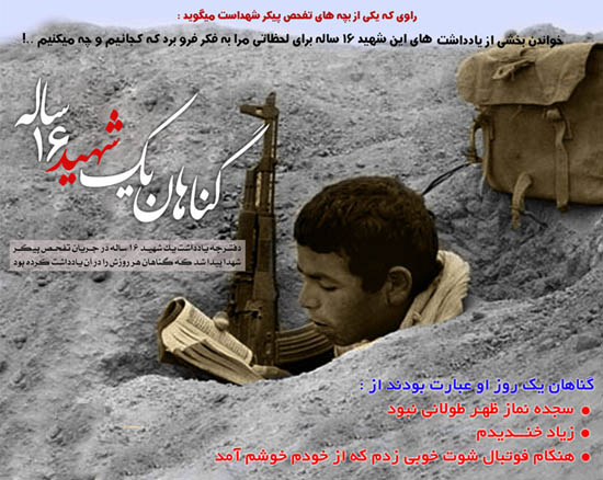 راوی که یکی از بچه های تفحص پیکر شهداست می گوید: خواندن بخشی از یادداشتهای این شهید ۱۶ ساله برای لحظاتی ما را به فکر فرو برد که کجائیم و چه می کنیم. گناهان یک روز او عبارت بودند از: